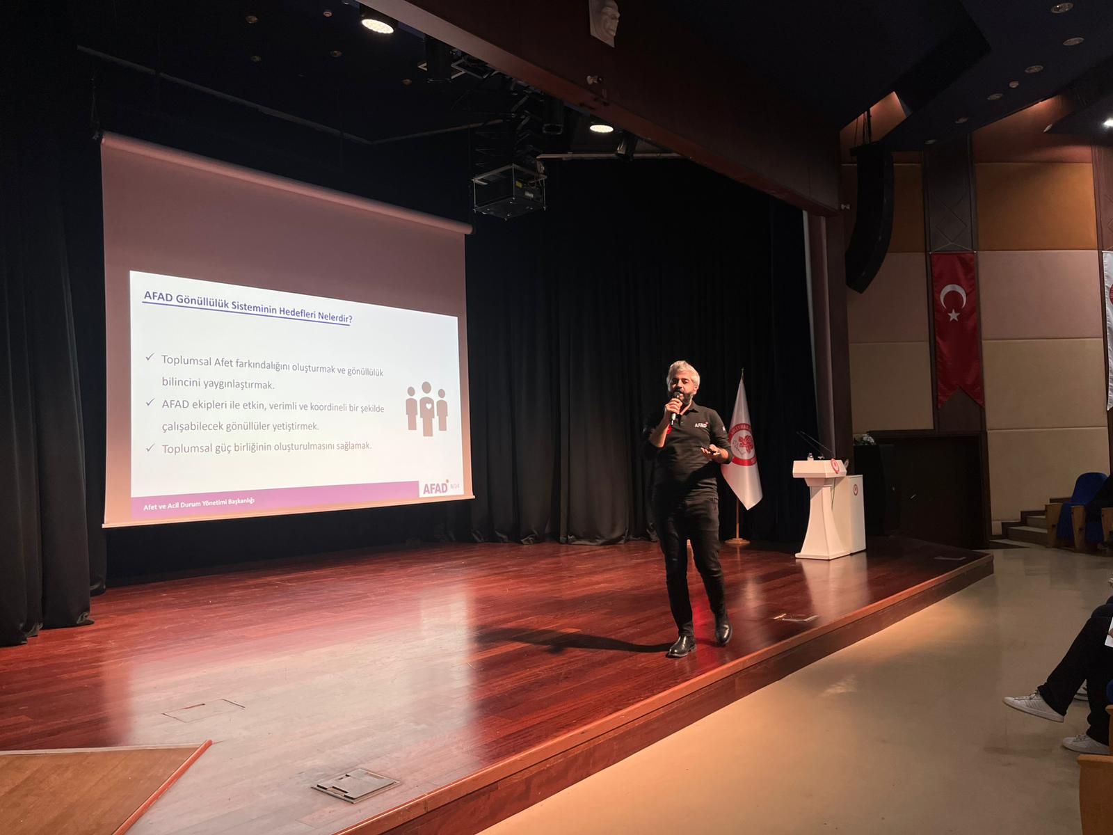 AFAD Gönüllü Koordinatörü Burak DURSUN ve Münür DELİKKAFA tarafından gerçekleştirilen sunumlarda; gönüllülük kavramının afet yönetimindeki önemi, gönüllülerin afet öncesi eğitim süreçleri, saha görevleri ve kriz anlarında koordinasyonun nasıl sağlandığı detaylı şekilde aktarıldı. Ayrıca AFAD Gönüllülük Sistemi üzerinden başvuru süreçleri, temel ve destek eğitim modülleri ile saha uygulamalarına ilişkin bilgilendirme yapıldı.